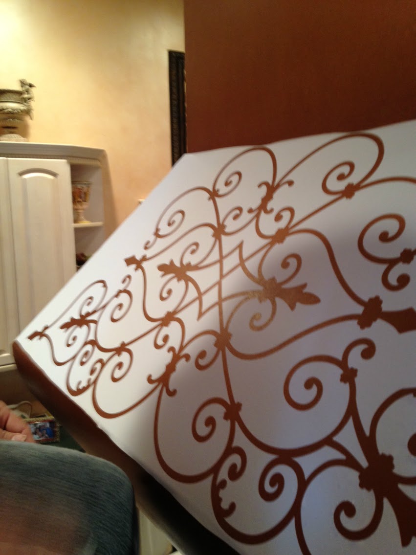 I suggested a few decorative motifs from Modello Designs – which I’ve talked about before (see the post about how I used an intricate one on my ceiling Here. This company makes one time use stencils that are truly gorgeous and intricate. Staci chose a lovely wrought iron gate looking design, which would go with the look in her kitchen. She has a lovely piece of wrought iron artwork over one of the doors in her kitchen, so the design would pick up on that. The placement of the design on the hood is perhaps one of the trickiest parts of the process. You have to measure and measure again to make sure the stencil is level and not lopsided. The adhesive on the underside of the Modello is pretty darn tacky…so if you make a mistake – it’s not all that forgiving. So – measure twice…place once!