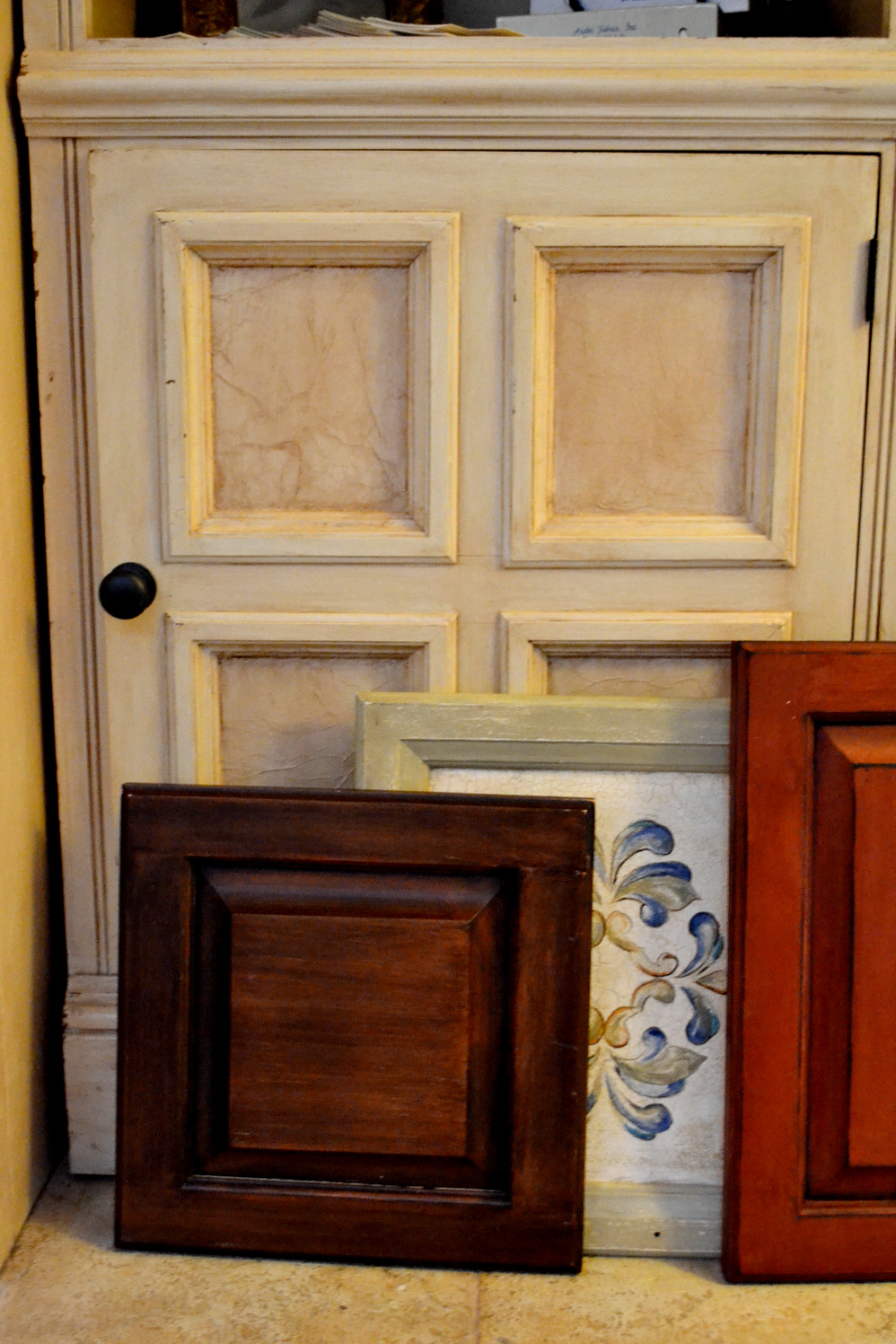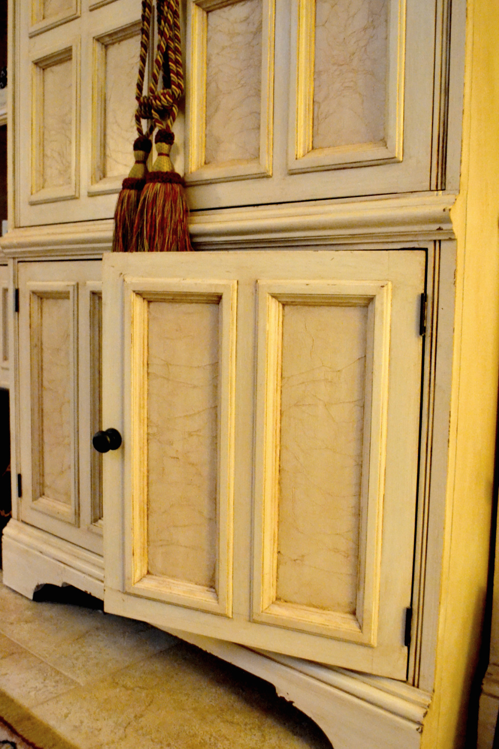 I wanted to give the piece a little bit more distinction because it was a little plain, architecturally speaking. So, for the recesses of the cabinet fronts, I crumpled up some gift wrapping tissue into a ball and then uncrumpled it and smoothed it a bit. I put another layer of the basepaint in the recesses of the cabinet fronts, placed the wrinkled tissue on – and then put another layer of the basepaint on.