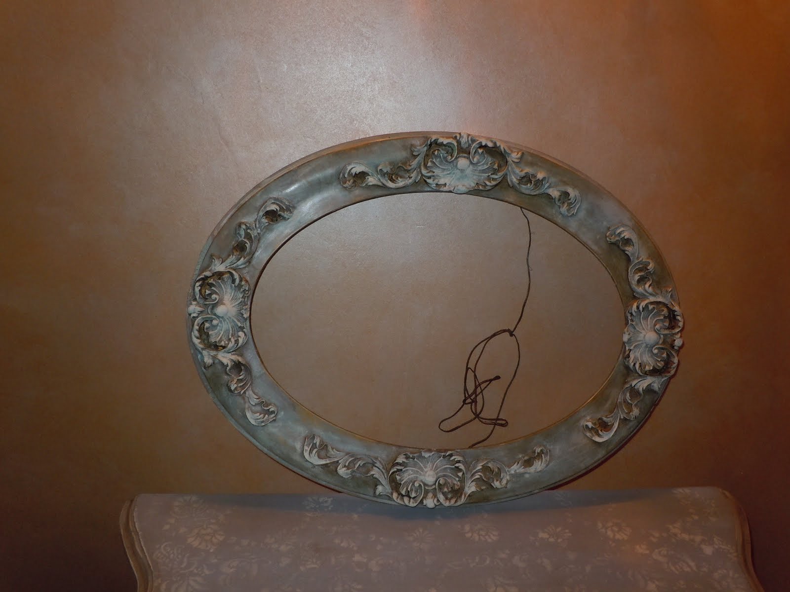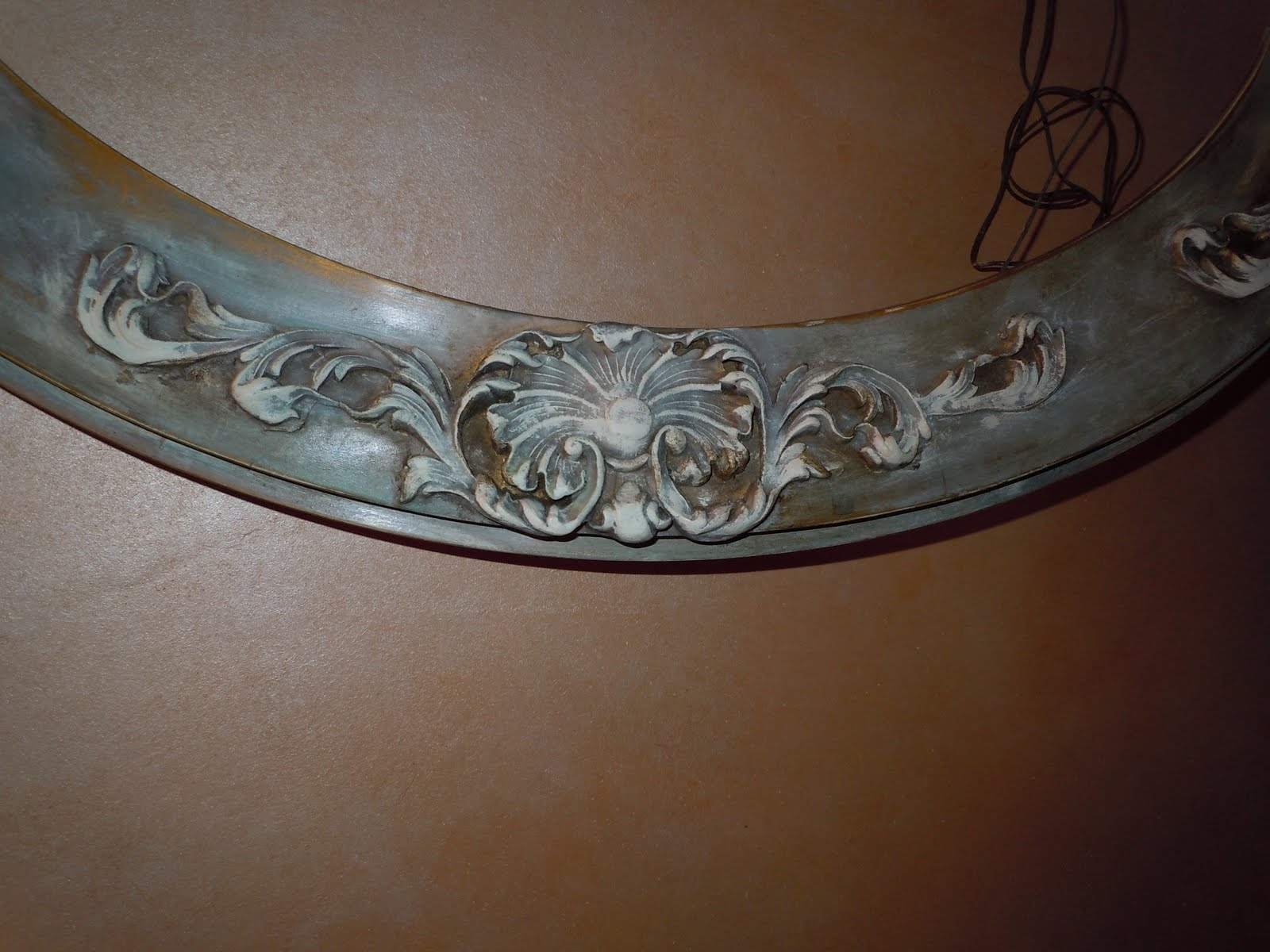 Now…for the mirror frame. I bought this ornate frame in an antique store in Sag Harbor. The store was going out of business, so I got it for a song – $20. It was dusty – but a nice shade of pale blue – so I just enhanced it a bit. I used some Chateau Gray, Paris Gray and Old White to highlight the carvings. I waxed and buffed – and put some Dark Wax in the crevices.
