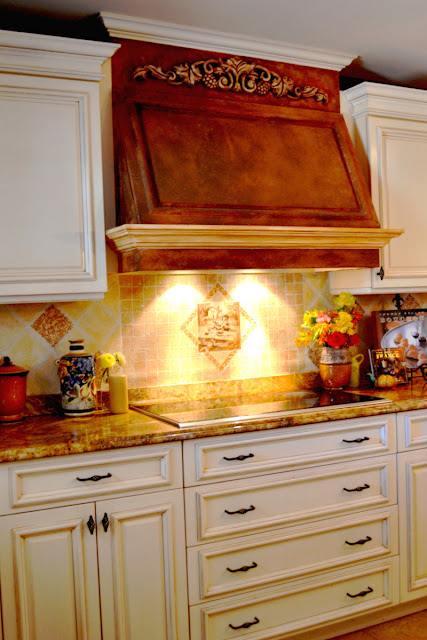 Beautiful kitchen! Love the painted effect on our stove hood! You are so talented (your friend too!)