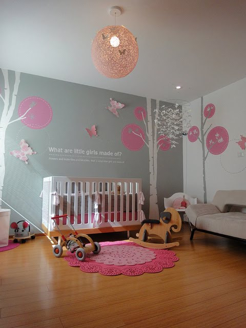 Paint Colors: Color is of course very personal. But I think that a soothing color is best for a nursery. A soft pastel blue, pale green or soft pink would work the best though. Make sure to paint several months before the baby arrives and use a zero or low VOC paint. For some visual candy for your baby, you can embellish your walls with a beautiful hand painted mural with a landscape theme – which can serve as a beautiful backdrop for many years to come.