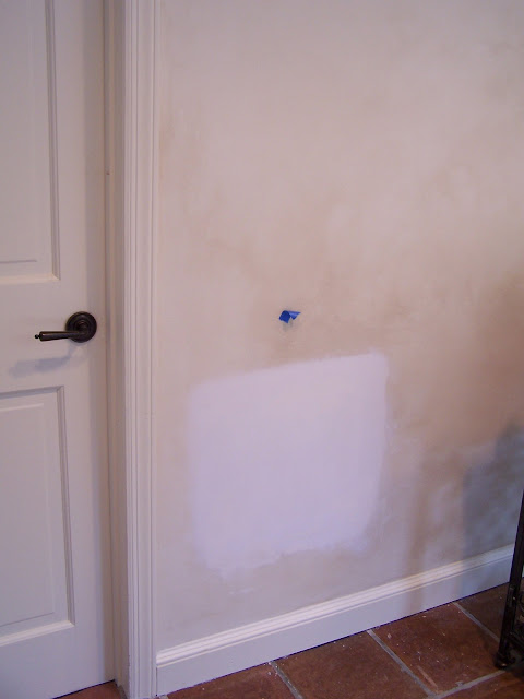 If you have never tried to fix a faux finish (especially when you didn’t do the finish in the first place as in this case), it’s one of the hardest things to do well. What happens is that you can’t just dot in the color into the patched and primed spot. It doesn’t work. If you try to do that, it just creates a halo effect and you can see where the “join” is. You have to create a color that is the closest to the base color and then you swish the color in…blending it in without following the outline of the patch. Then add a little darker glaze and feather that in – as in the drifts that are part of this finish. Sounds easy but it wasn’t at all.