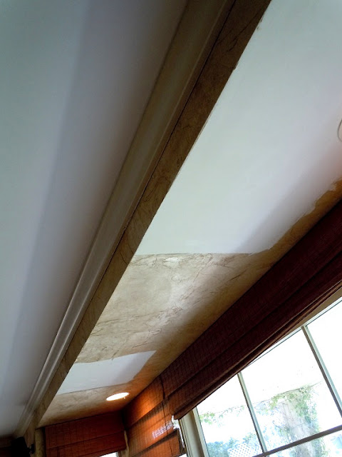 Since the home sellers did not have the paper that was used, I had to improvise. I primed the areas, then used gift tissue, slightly wrinkled (like I did on my Bookcase Project) then painted it. I created a glaze color that matched the color of the paper and then glazed the whole ceiling.