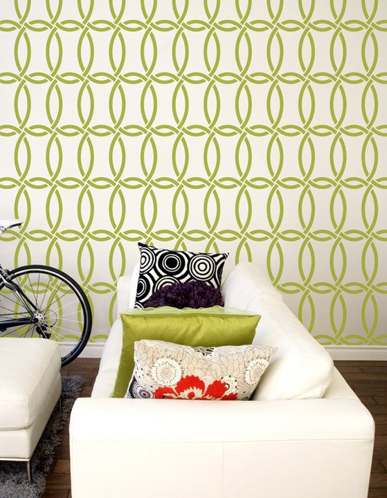 This is “Chain Link” from her new collection. It looks very modern and “today, ” unlike what many people feel about stencils – old and grandma-like!  I just love using geometric patterns in interiors.