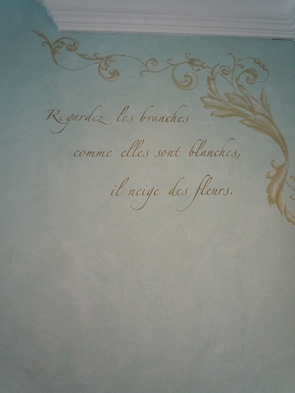 We also did the stairway going up to the second floor. Again, we did a subtle colorwashed finish that anyone could afford to have done in their home. It’s simple – yet so beautiful. We added a little “Hello” as you enter the stairway…a beautiful scroll and some French wording from a famous poem “Le Printemps.” It’s understated – but very memorable. Faux finishing used to be loud and all about the tool that you used – but today’s professional finishes and subtle and lovely and they add beauty without “being in your face.”