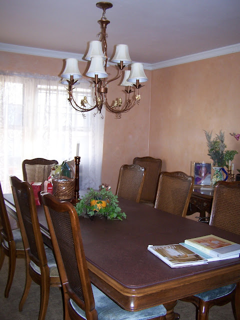 While I am awaiting the news of my new granddaughter’s birth (it should happen within a few hours…I can’t wait!!), I thought I’d share a project that I did in my home recently…my dining room moldings and some metallic plaster and decorative pattern on the ceiling. Here are some before shots…