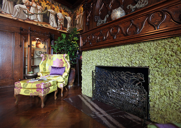 The use of multiple resin tables makes the room more playful, modern, as well as informal and functional. I loved the creative use of reindeer moss on the stone fireplace that was beyond repair. This was a stroke of genius – and it adds to the whimsy of the room. Another modern touch was on the traditional mural that had some “bubble quotations” from the figures, i.e. “I never looked so good.”