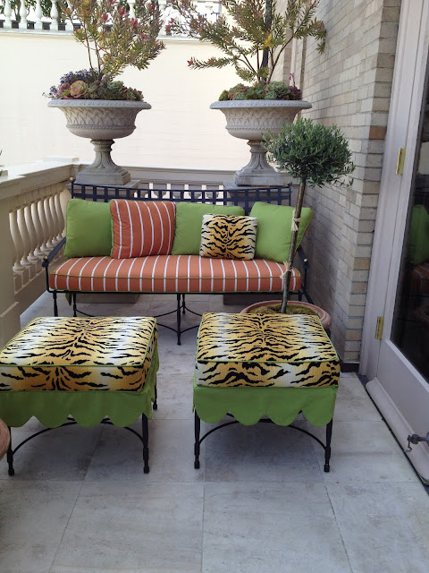 I just loved this furniture from the Barlett Collection with these tiger striped ottomans with the green and coral fabrics.