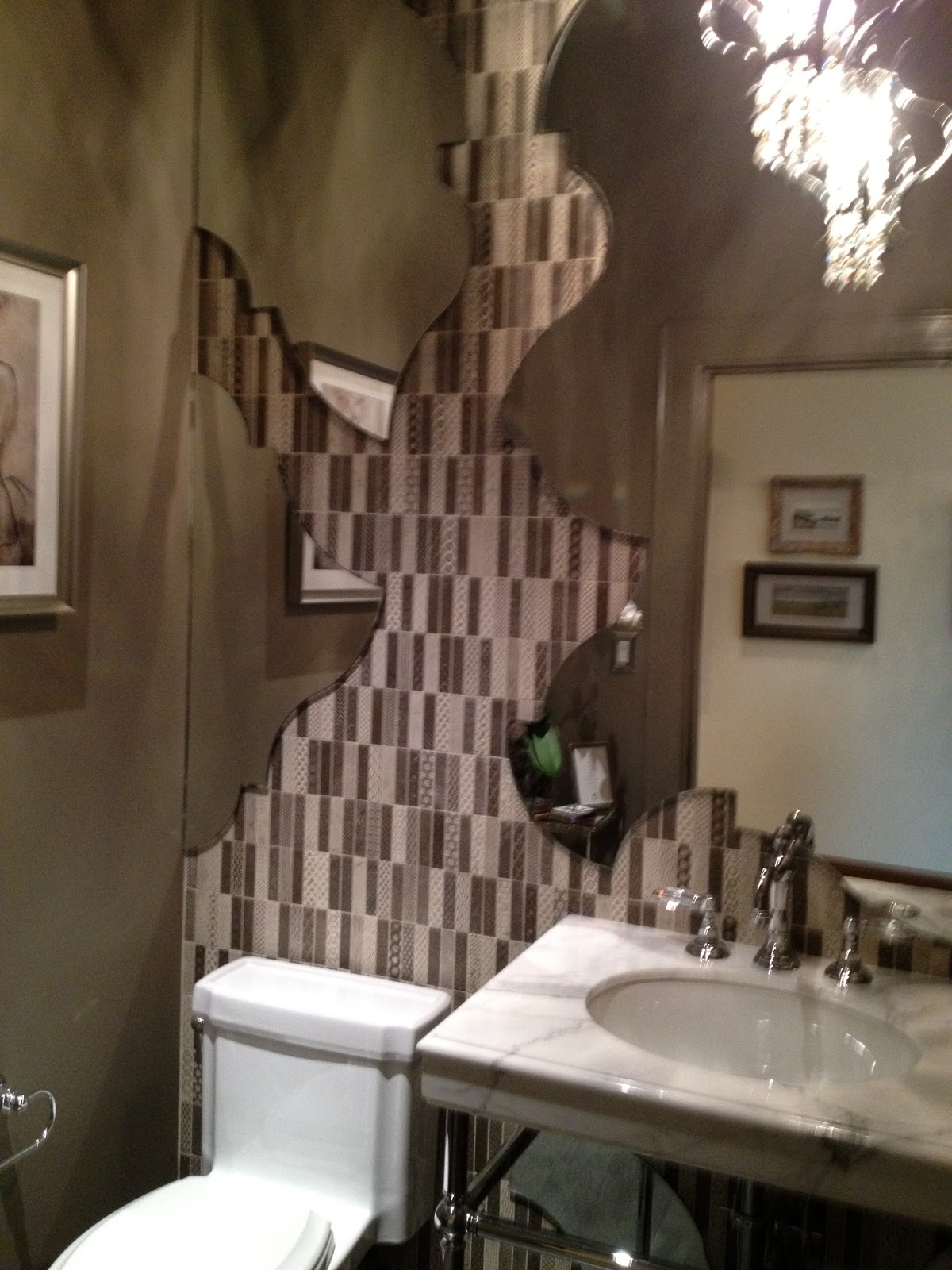 The designers, Joe McGuire and Sophia Kabler Cowley of KCS Inc, wanted to blur the typical lines of mirror and vanity and so they created this mosaic of tile and mirror on the wall. The mirror cuts away to reveal “Tacciato Diva” tile by Walker Zanger. This artistic feat must have taken many days to do – it was really beautiful.