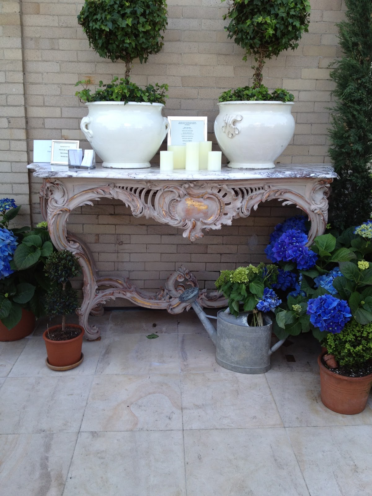 I loved this 1920s marble console, which the designer aged by painting over the original brass base. Purists would say “Don’t touch it!” but I think it looks great and in keeping with the theme and color fo the terrace. Beautiful job! I love the old watering can with the hydrangeas spilling out – I have been thinking of doing this with an antique red watering can that I bought recently at the New York Gift Show.