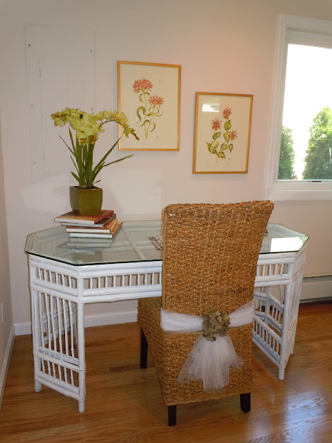 Some of the bamboo wrungs were missing but my husband found a few “look-a-likes” around our house (stem supports from faux orchid pots) and replaced them. When I found the piece it was sitting right outside the basement of the shop in a natural but very grayish state. I cleaned it up and I spray painted it with gloss white – and voila – a lovely little accent piece. I use this a lot when I’m staging because it’s very light and transportable and I think it looks beautiful. In the future, I’d like to do an etched design on the glass – I think that that will really be lovely.